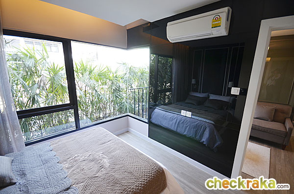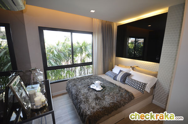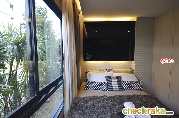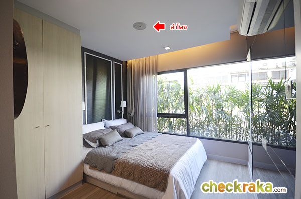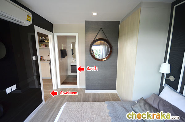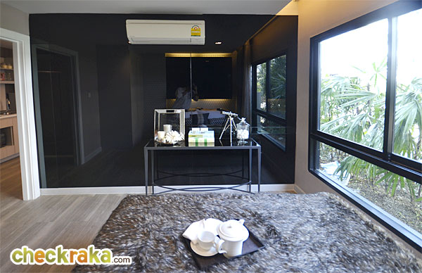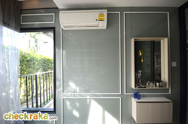 พื้นที่ปลายเตียงยังพอมีพื้นที่สำหรับตั้งโต๊ะวางของได้ หรือจะติดทีวีไว้ที่ผนังก็ยังได้ ส่วนผนังจริงเป็นผนังฉาบเรียบสีขาวเท่านั้น กระจกที่เห็นเป็นเพียงของตกแต่ง ในห้องนี้ทางโครงการติดตั้งแอร์ Daikin ขนาด 9,000 BTU มาให้ด้วยอีก 1 ตัว