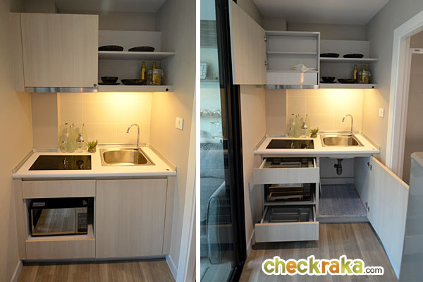 ในส่วนของห้องครัวเป็นแบบครัวเปิดเหมือนครัวฝรั่ง ได้ชุดครัว Built-in ตามนี้เลยค่ะ ไม่ว่าจะเป็น เครื่องดูดควัน,