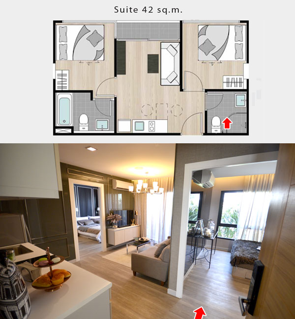 2) ภาพห้องตัวอย่างแบบ 2 ห้องนอน Suite ขนาด 42.6 - 45.7 ตร.ม