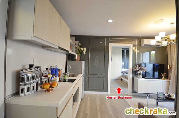 ทางด้านซ้ายมือจะเป็นส่วนของห้องครัว ที่เชื่อมต่อกับห้อง Master Bedroom และห้อง Living room