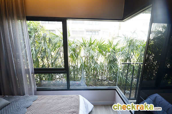 หน้าต่างห้องนอนเป็นหน้าต่างกระจกบานเลื่อนแบบ Bay Window เพิ่มความรู้สึกเสมือนได้อยู่ห้องมุม