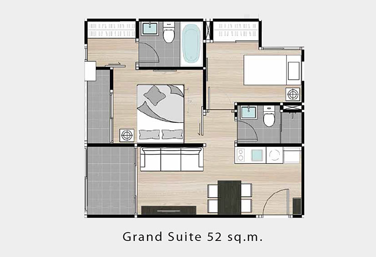 ขนาด 42.6 ตร.ม. ราคาเริ่มต้นประมาณ 3.5 ล้านบาท - ห้องแบบ GRAND SUITE (2 ห้องนอน)