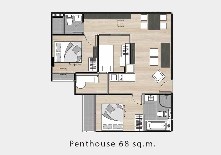 ขนาด 52.4 ตร.ม. ราคาเริ่มต้นประมาณ 4.4 ล้านบาท - ห้องแบบ PENTHOUSE (2 ห้องนอน)