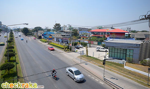 ลองเดินขึ้นสะพานลอยกันดูค่ะ มองหันกลับไปที่หน้าโครงการก็จะเห็นที่ตั้ง Sales Gallery อยู่ริมถนนอย่างชัดเจน