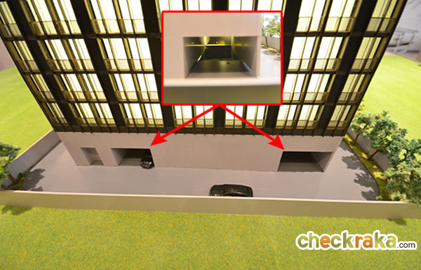 ส่วนที่จอดรถจะอยู่ชั้นใต้ดิน (ชั้น B1 - B5) โดยทางขึ้น-ลงจะอยู่ทางทิศตะวันตกของตัวอาคาร