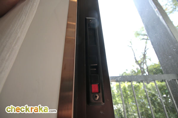 เป็นประตูกระจกบานสไลด์ 2 ตอน กรอบอลูมิเนียมสีดำ สูงจรดฝ้าซึ่งมีความสูงถึง 2.95 เมตร