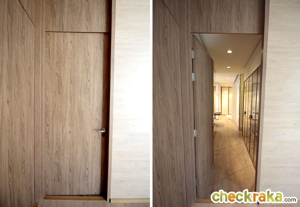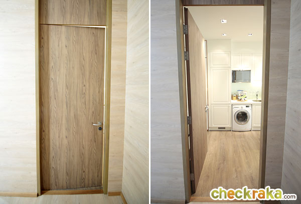 ประตูหน้าห้องเป็นประตูลายไม้บานสูง ขนาด 2.4 x 0.9 เมตร