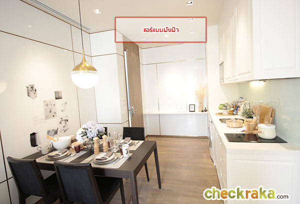 ห้องจริงจะได้แอร์แบบฝังฝ้า 1 ตัว จะอยู่บริเวณประตูทางเข้าห้อง โดยจะ Drop ฝ้าลงมาอยู่ที่ประมาณ 2.5 เมตร