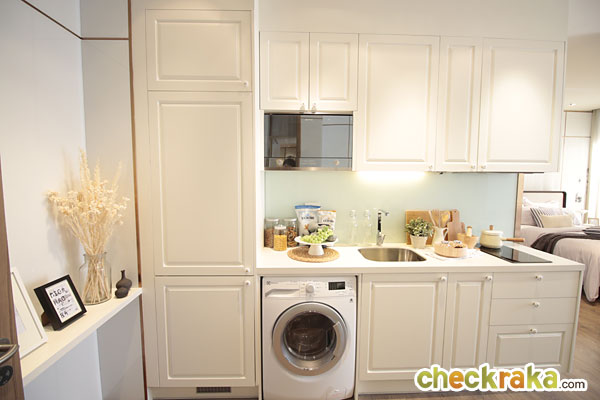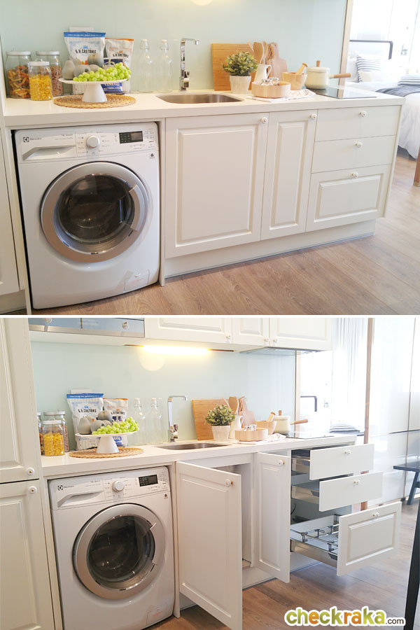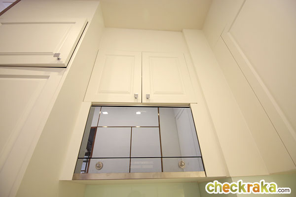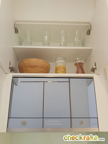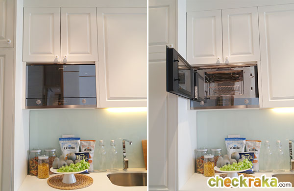 ให้เตาอบอยู่ทางฝั่งซ้ายของครัว เหนือตำแหน่งเครื่องซักผ้า ด้านบนมีตู้เก็บของให้มาด้วย แต่อยู่ค่อนข้างสูงไปซักหน่อย สำหรับผู้หญิงตัวเล็ก อาจจะหยิบจับไม่ค่อยสะดวกเท่าไหร่
