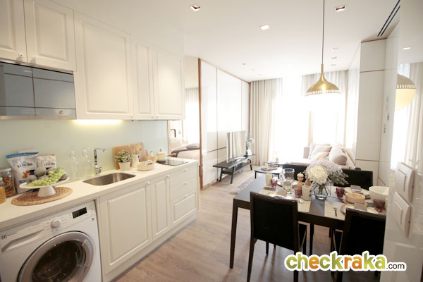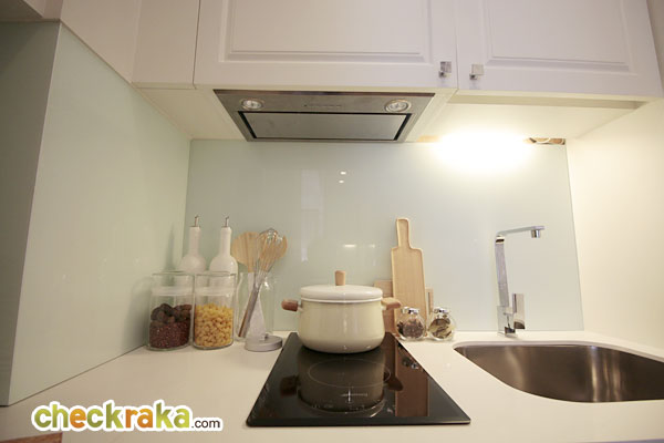 พื้นที่ใช้สอยบริเวณครัวขนาดกะทัดรัด ไม่ใหญ่มาก พร้อมชุดเครื่องครัว Built-in