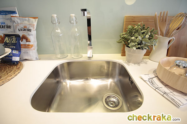 ล้างจานเป็นแบบหลุมเดียว ยี่ห้อ Smeg ก็อกน้ำ ยี่ห้อ Mex พร้อมผนังเคาน์เตอร์ครัวแบบกระจกง่ายต่อการทำความสะอาด