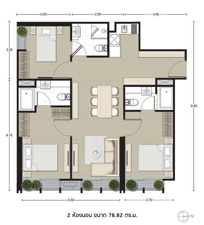 2) ห้องแบบ 3 ห้องนอน ขนาด 76.82 ตร.ม.