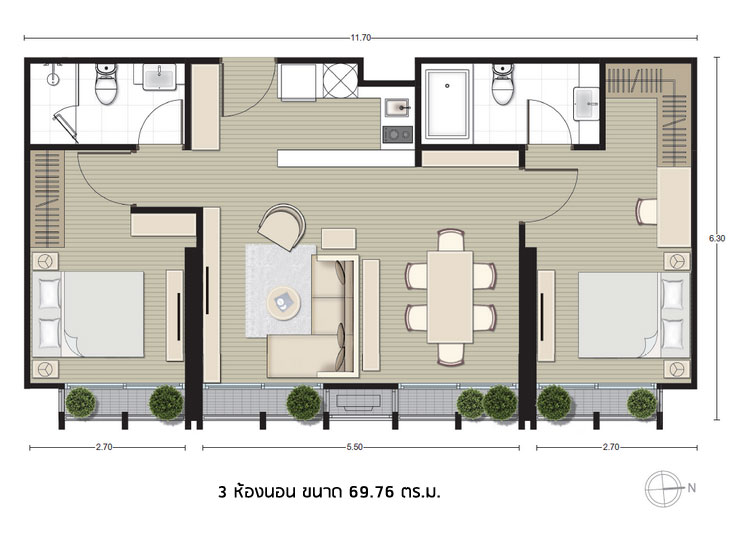 (คลิกเพื่อชมตัวอย่างแปลนห้องขนาดใหญ่) - ห้องแบบ 2 ห้องนอน (2 ห้องนอน, 2 ห้องน้ำ, 1 ห้องครัว) พื้นที่ใช้สอย 51 - 69 ตร.ม.