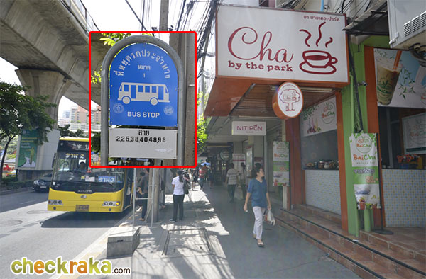 สิ่งแรกที่เห็นคือป้ายรถเมล์ ส่วนใหญ่รถเมล์ที่วิ่งจากจุดนี้จะไปสิ้นสุดที่ ปากคลองตลาด,