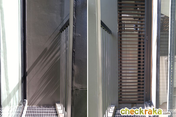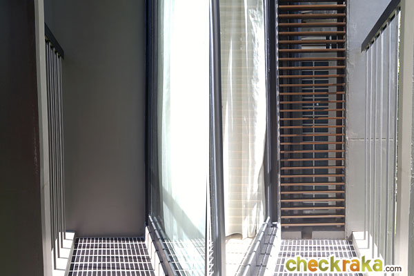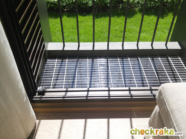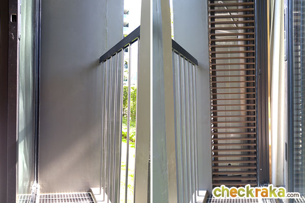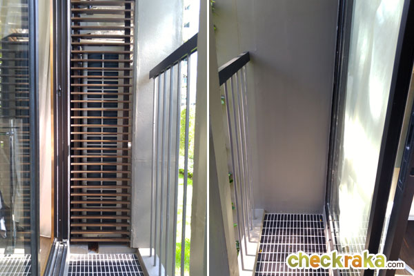 ระเบียงด้านนอกเหมือนกันกับห้องที่แล้ว มีคอมเพรสเซอร์แอร์ตั้งอยู่ทางด้านขวาของระเบียง