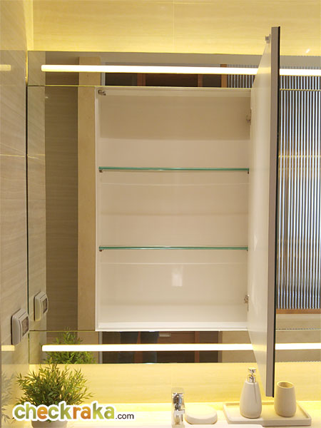 กระจกเงาเปิดได้ด้วยนะคะ ด้านในจะเป็นชั้นวางของ สำหรับวางของใช้ในห้องน้ำ หรือเครื่องสำอางของคุณผู้หญิงได้เลย