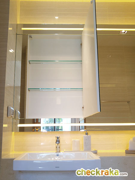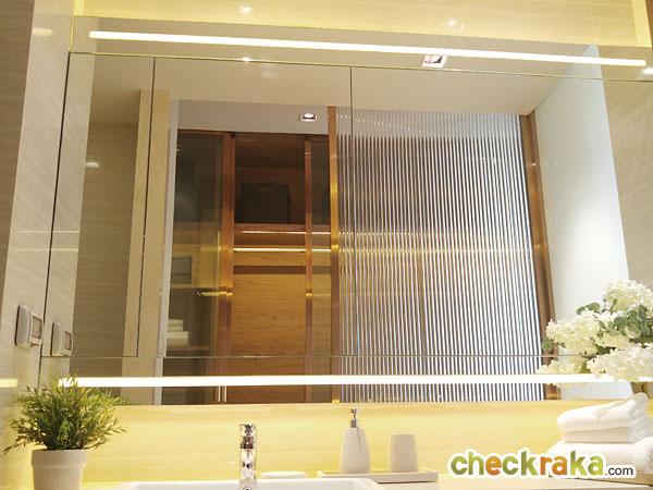 ในห้องน้ำมีกระจกเงาบานใหญ่มาให้ พร้อมไฟซ่อนทั้งด้านบนและด้านล่างของกระจก