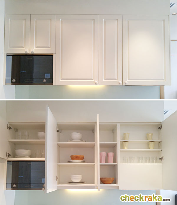 เคาน์เตอร์ครัวมีช่องเก็บของมาให้ด้วยทั้งด้านบนและด้านล่าง ด้านบนเป็นตู้เก็บของแบบนี้