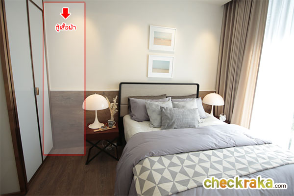 เพราะว่าห้องจริงตู้เสื้อผ้าจะอยู่ฝั่งเดียวกับหัวเตียงประมาณตรงนี้ค่ะ