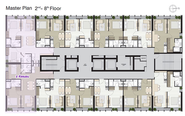 Master Plan ชั้น 2-8 จะเป็นส่วนพักอาศัย มียูนิตต่อชั้นอยู่ที่ 12 ยูนิต แบ่งเป็นห้องแบบ 2 ห้อง จำนวน 2 ยูนิต จะอยู่ด้านมุมอาคารฝั่งทิศใต้ของอาคาร และที่เหลืออีก 10 ยูนิตเป็นห้องแบบ 1 ห้องนอน