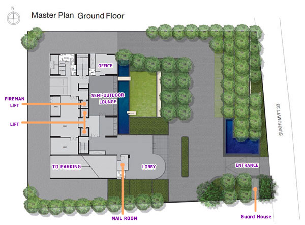 Master Plan ชั้น G มี Lobby, Semi-Outdoor Lounge, ลิฟต์โดยสาร 2 ตัว, ลิฟต์บริการ 1 ตัว และพื้นที่สวนสีเขียว