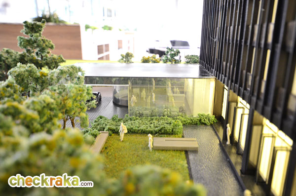 โมเดลโครงการมุมมองจากทิศตะวันตก ติดอาคารพักอาศัยสูงประมาณ 2 ชั้นเช่นกัน