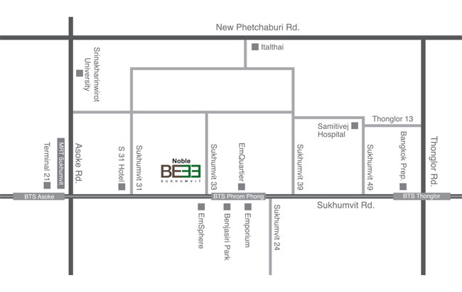 ในส่วนของสภาพแวดล้อมใกล้เคียง คงจะต้องกล่าวถึงโปรเจค The EM District เป็นอันดับแรก เนื่องจากเป็นศูนย์กลาง-ย่านช้อปปิ้งแห่งใหม่บนถนนสุขุมวิท และย่านการค้าขนาดใหญ่ที่สุดอีกแห่งหนึ่งของอาเซียน ที่จะรวมเอาโรงแรม ออฟฟิศและความบันเทิง มาไว้ที่เดียวกัน ดังนั้น Noble BE33 จึงอาจเป็นคอนโดมิเนียมที่น่าอิจฉามากที่สุดในขณะนี้ และเรียกได้ว่าเด่นในเรื่องของทำเลมากจริงๆ ค่ะ