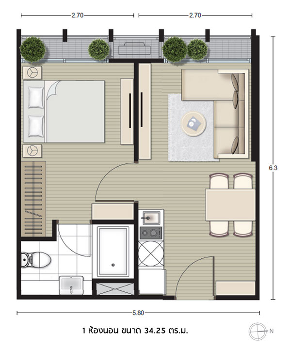 Layout ห้องแบบ 1 ห้องนอน ขนาด 34.72 ตร.ม. มี 1 ห้องน้ำ 1 ห้องนั่งเล่น และ 1 ห้องครัว (แบบเปิด)