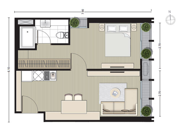 - ห้องแบบ 1 ห้องนอน (1 ห้องนอน, 1 ห้องน้ำ, 1 ห้องครัว) พื้นที่ใช้สอย 34 - 43 ตร.ม.