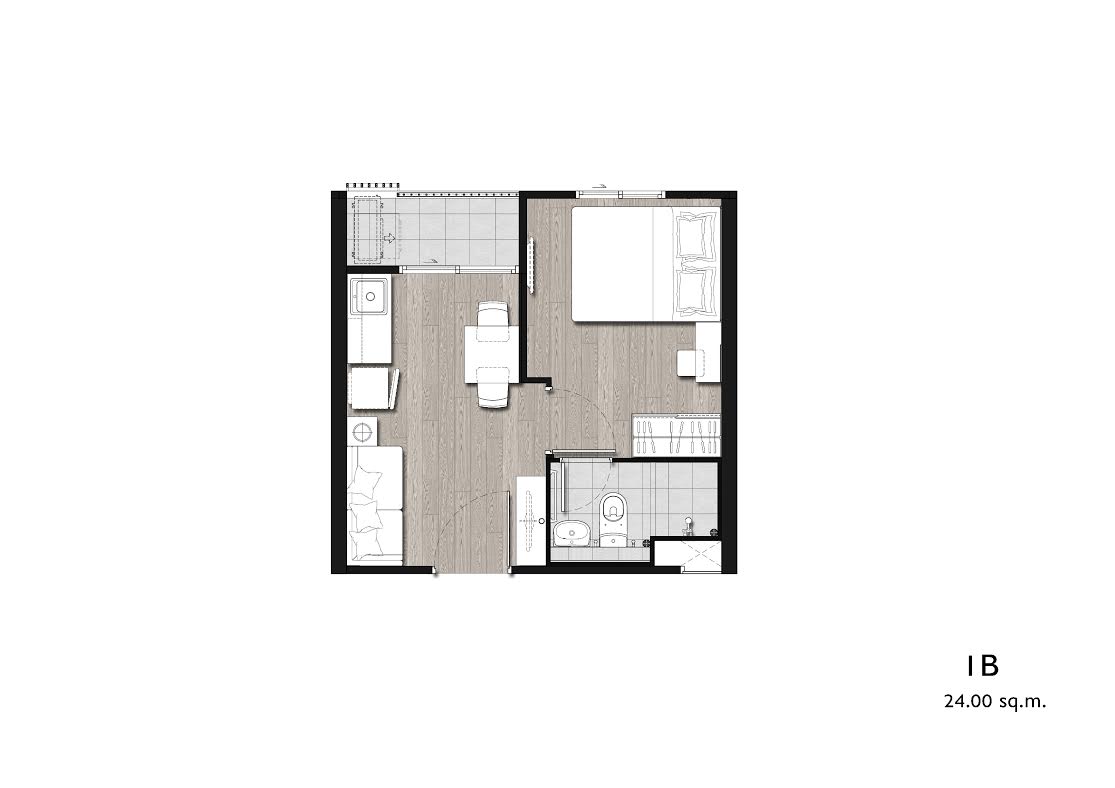 1) ภาพห้องตัวอย่างแบบ 1B ห้องแบบ 1 ห้องนอน ขนาด 24 ตร.ม.