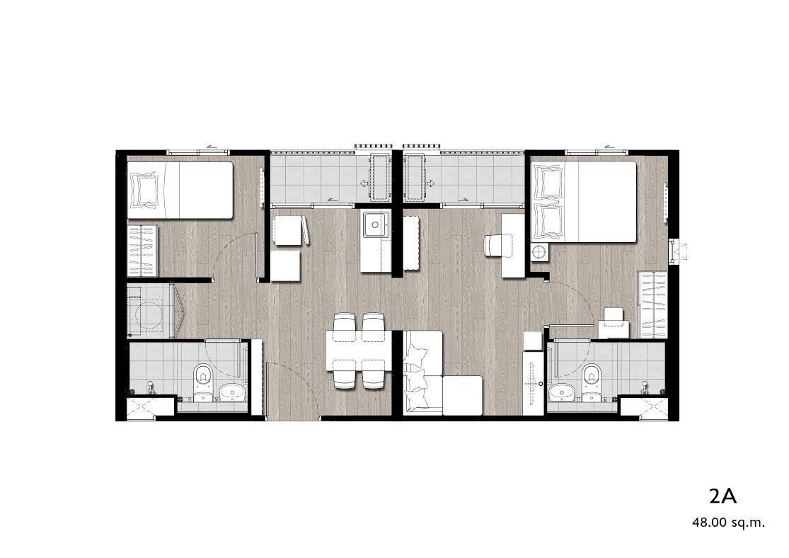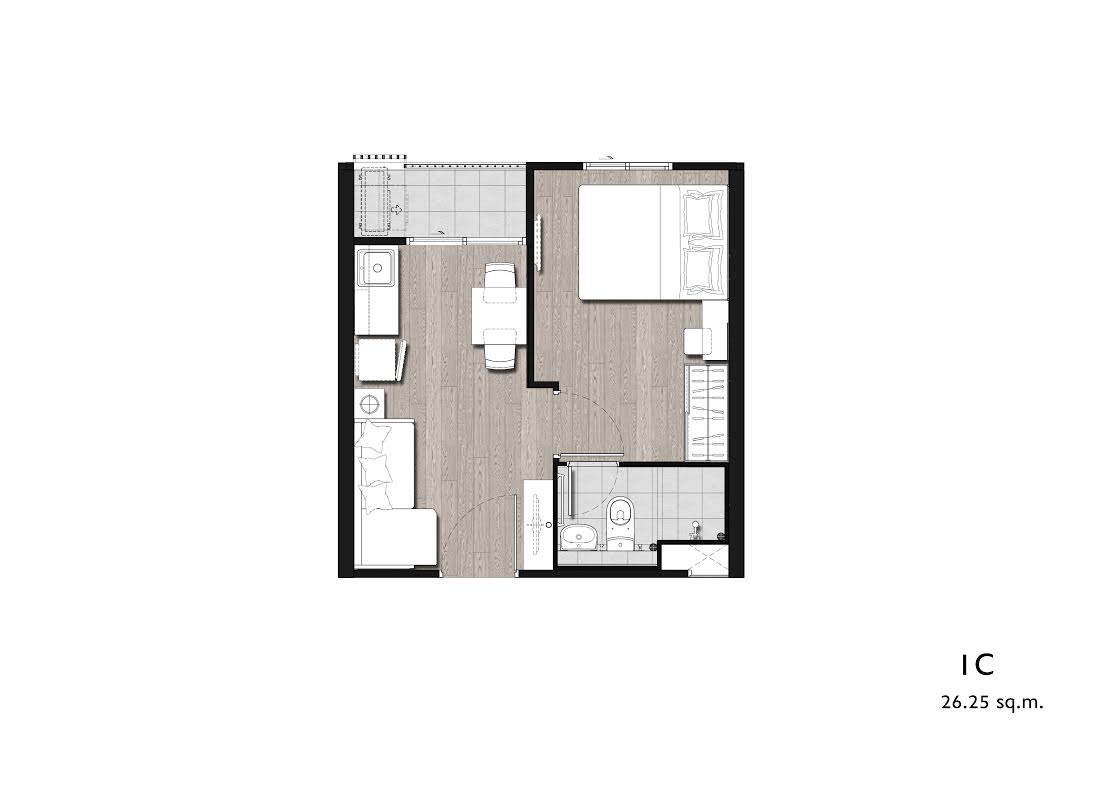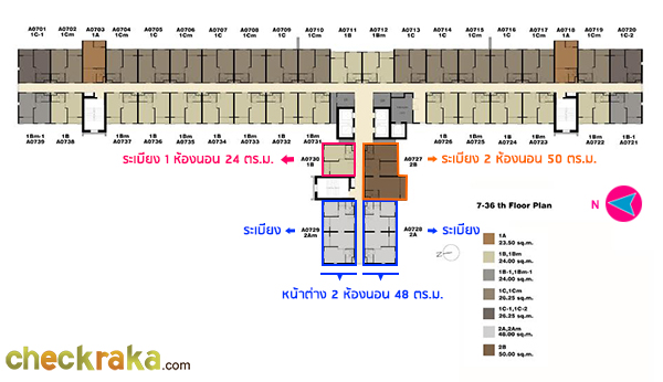 Floor Plan ชั้น 7-36 เป็นห้องพักอาศัยที่มีขนาดของยูนิตเหมือนกับ Floor Plan ชั้น 6 เพียงแต่ เพิ่มห้องขนาด 24 ตร.ม.ขึ้นมา เนื่องจากตรงชั้น 6 ยุบห้องไซส์นี้ออกเพราะเป็นในส่วนของสวนพักผ่อน โดยมีห้องพักให้เลือกทั้งหมด 5 ขนาดด้วยกันคือ 1A ห้องแบบ 1 ห้องนอน (1 ห้องนอน, 1 ห้องน้ำ, 1 ห้องครัว) - เนื้อที่ 23.5 ตร.ม. (คลิกเพื่อชมแปลนห้องขนาดใหญ่) 1B ห้องแบบ 1 ห้องนอน (1 ห้องนอน, 1 ห้องน้ำ, 1 ห้องครัว) - เนื้อที่ 24 ตร.ม. (คลิกเพื่อชมแปลนห้องขนาดใหญ่) 1C ห้องแบบ 1 ห้องนอน (1 ห้องนอน, 1 ห้องน้ำ, 1 ห้องครัว) - เนื้อที่ 26.25 ตร.ม. (คลิกเพื่อชมแปลนห้องขนาดใหญ่) 2A ห้องแบบ 2 ห้องนอน (2 ห้องนอน, 2 ห้องน้ำ, 1 ห้องครัว) - เนื้อที่ 48 ตร.ม. (คลิกเพื่อชมแปลนห้องขนาดใหญ่) 2B ห้องแบบ 2 ห้องนอน (2 ห้องนอน, 2 ห้องน้ำ, 1 ห้องครัว) - เนื้อที่ 50 ตร.ม. (คลิกเพื่อชมแปลนห้องขนาดใหญ่) Layout ห้องแบบ 1 ห้องนอน ขนาด 24 ตร.ม.