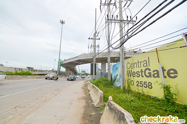 เซ็นทรัล เวสต์เกต จะเห็นว่าข้างหน้ามีสะพานลอยให้ข้ามไปอีกฝั่งได้ด้วย ปัจจุบันหน้าห้างจะมีของกินขายให้กับคนที่ผ่านไป-มาแถวนี้ และขายให้กับคนงานก่อสร้างค่ะ