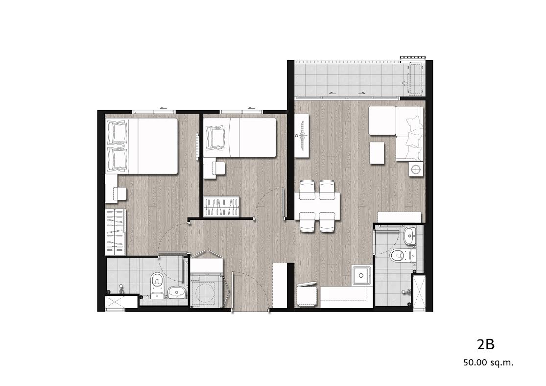 ส่วนห้องที่มีขนาด 50 ตร.ม. จะเป็นห้องมุมหันหน้าไปทางทิศใต้