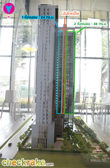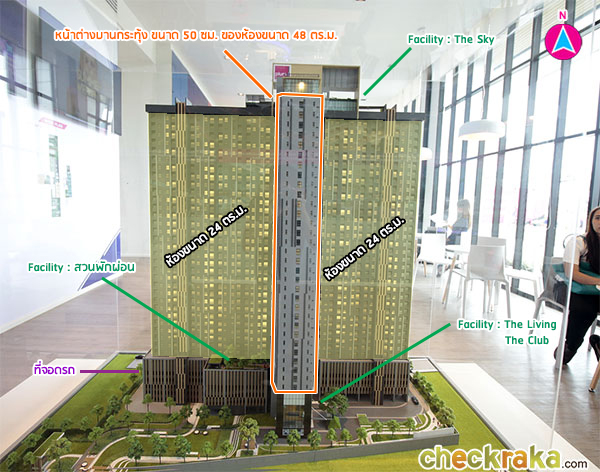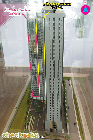 ห้องแบบ Combine ขนาด 48 ตร.ม. โมเดลโครงการหันหน้าไปทางทิศใต้ติดถนนรัตนาธิเบศร์ โมเดลโครงการหันหน้าไปทางทิศตะวันออกเจอรถไฟฟ้าสถานีสามแยกบางใหญ่ ประกอบด้วยห้องพักอาศัยมีขนาด 23.5 ตร.ม., 24 ตร.ม. และ 26.25 ตร.ม. โมเดลโครงการหันหน้าไปทางทิศเหนือเจอหมู่บ้านรัตนาธิเบศร์ โมเดลโครงการจากมุมสูงเป็นส่วนของ Facility ของโครงการที่รวมเอาสระว่ายน้ำ, ฟิตเนส, ห้องโยคะ,