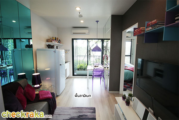 ห้องแบบ 1B เป็นห้องที่มีขนาด 24 ตร.ม. มี 1 ห้องนอน, 1 ห้องน้ำ, 1 ห้องนั่งเล่น และ 1 ห้องครัว (แบบเปิด) เมื่อเปิดประตูเข้ามาจะเจอกับโซนห้องนั่งเล่น ถัดไปเป็นโต๊ะรับประทานอาหาร และระเบียง พื้นเป็นแบบลามิเนตหนา 8 มม. ยังอยู่ที่โซนห้องนั่งเล่นนะคะถ้าหันหลังให้ทีวีจะเห็นว่าทางโครงการตกแต่งเคาน์เตอร์ครัวให้อยู่ฝั่งเดียว