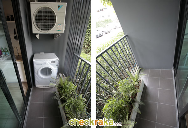 แบบ 2 บาน ระเบียงมีขนาดประมาณ 1x2 ม. สามารถวางเครื่องซักผ้า และก็ยังวางราวตากผ้าได้อีกนะคะ