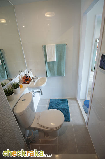 ในห้องน้ำถูกแบ่งโซนให้แยกระหว่างพื้นที่เปียก (ฝักบัว) และพื้นที่แห้ง (สุขภัณฑ์)