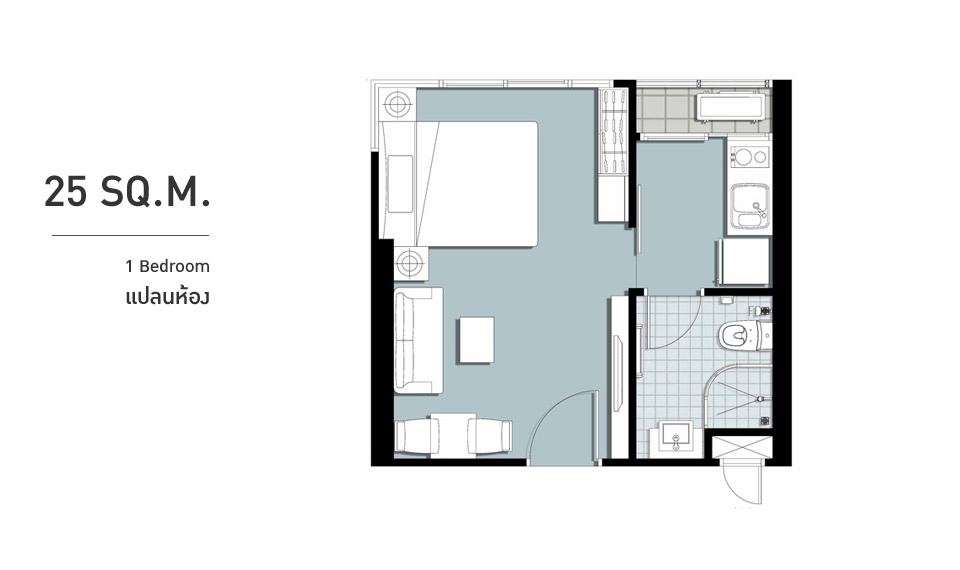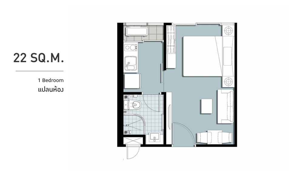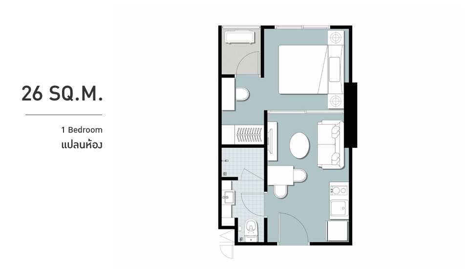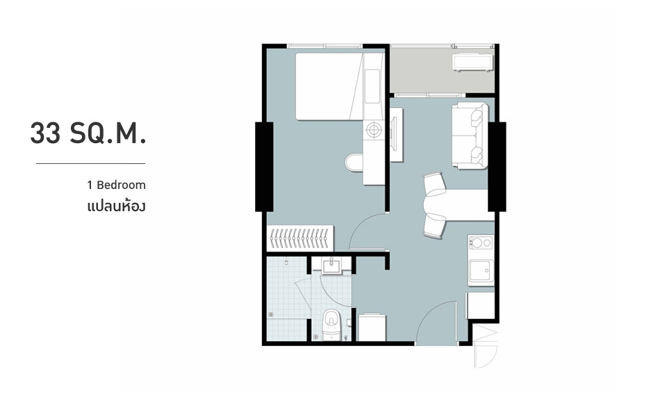 ปลายเตียงสามารถติดโทรทัศน์แบบแขวนผนังได้ และยังมีพื้นที่เล็กๆ ให้วางของหรือวางตู้เสื้อผ้าด้วยค่ะ
