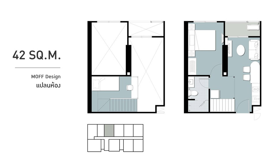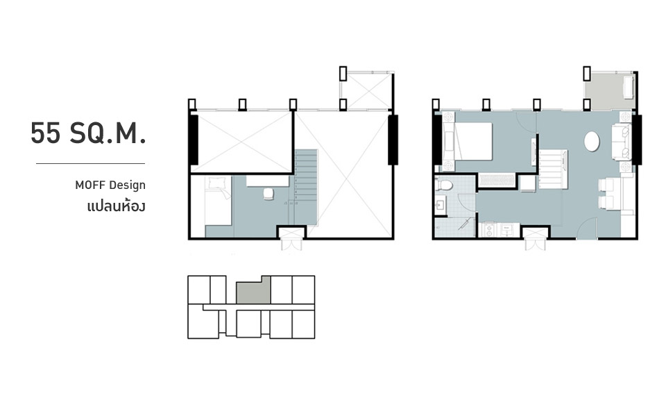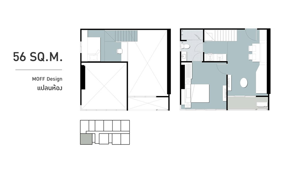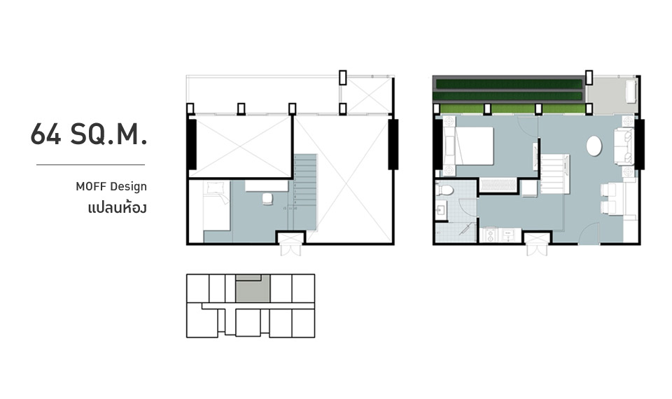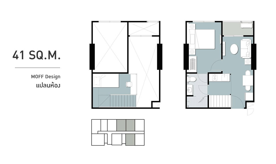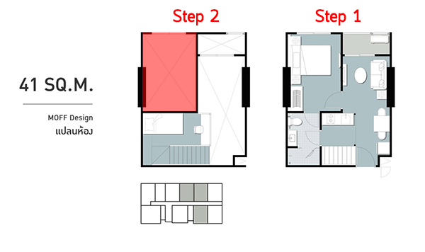 2. ห้องแบบ MOFF Design โดยจะอยู่ที่ชั้น 18-22 ของอาคาร D และ E เท่านั้น สำหรับห้องที่เราจะพาทุกท่านไปเยี่ยมชมวันวันนี้ก็คือห้อง MOFF Design แบบ 2 ห้องนอน ขนาด 41 ตร.ม.ค่ะ จุดเด่นของ MOFF Design นอกจากมีอีก 1 ชั้นยกขึ้นเพื่อเป็นห้องอเนกประสงค์แล้ว อีกอย่างหนึ่งก็คือมีความสูงจากพื้นถึงเพดานที่สูงสุดถึง 4.55 เมตร