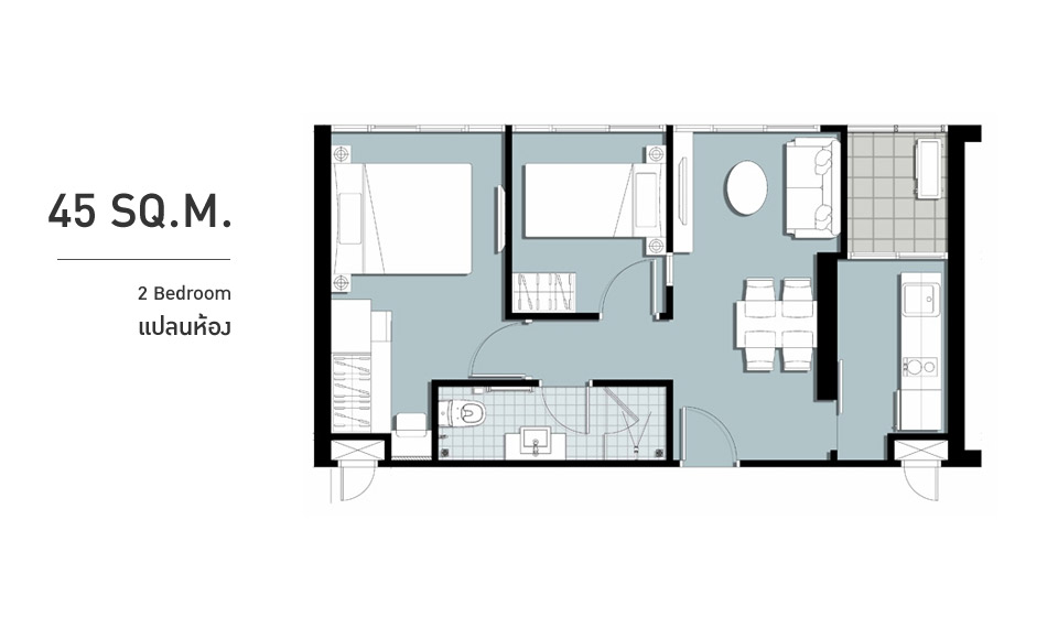 เข้ามาเจาะดูรายละเอียดกันบ้าง เข้ามาในห้องแล้วมองไปทางซ้ายมือทางโครงการจัดเป็นโซนรับประทานอาหารไว้ค่ะ วางชุดโต๊ะและเก้าอี้สำหรับ 2 ท่านเอาไว้ ชิดกับประตูมีพื้นที่สำหรับไว้วางตู้เย็น