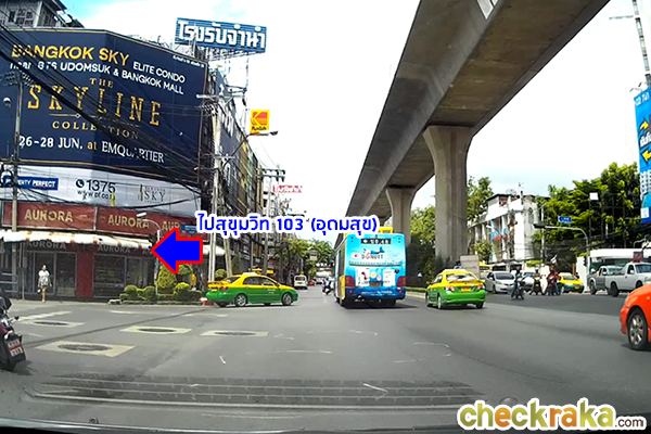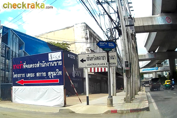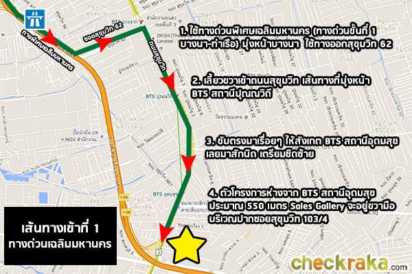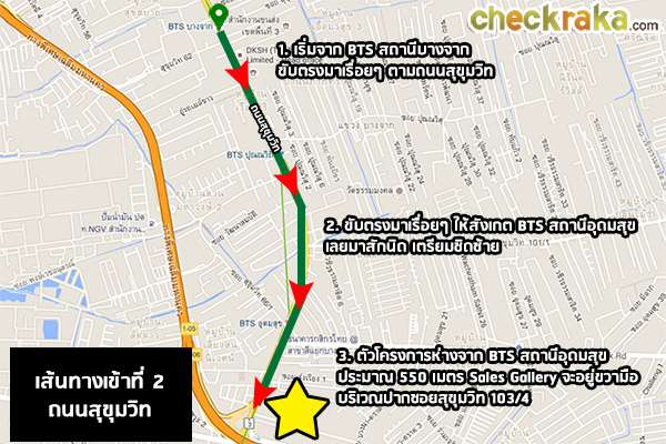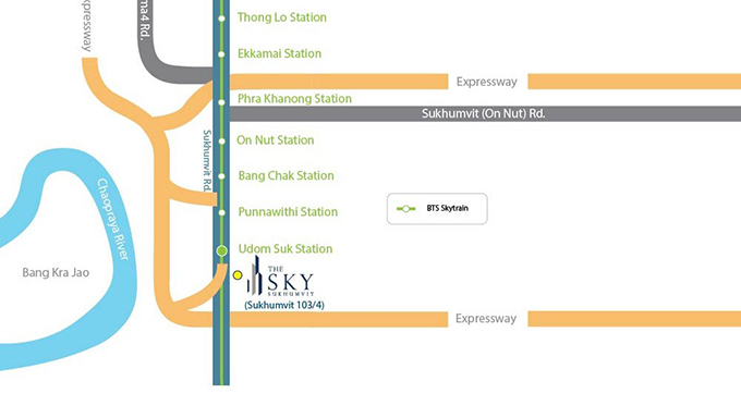 หลังลงจากทางพิเศษเฉลิมมหานครแล้ว เราจะใช้ทางออกสุขุมวิท 62 ค่ะ จะเจอสามแยกไฟแดงเพื่อเข้าถนนสุขุมวิท หากเลี้ยวซ้ายไปจะเข้าเมืองไปทางอ่อนนุช แต่เราจะไปโครงการ The Sky Sukhumvit ให้เลี้ยวขวา เพื่อไปทางบางนา สังเกตข้างหน้ามีป้ายโฆษณาของโครงการด้วยค่ะ เลี้ยวขวามาจะเจอ BTS สถานีปุณณวิถี และ BTS สถานีอุดมสุข ตามลำดับ ถึงแยกอุดมสุขแล้วค่ะ หากจะเข้าซอยอุดมสุขให้เลี้ยวซ้าย แต่เราจะขับตรงไปค่ะ จากแยกอุดมสุข ขับต่อมาเรื่อยๆ ประมาณ 500 เมตร จะเห็น Sales Gallery ของโครงการอยู่ด้านซ้ายมือค่ะ เลี้ยวซ้ายเข้าที่จอดรถของโครงการเลยค่ะ ซึ่งจะอยู่ในซอยสุขุมวิท 103/4 พอดี ถึงหน้าโครงการ The Sky Sukhumvit แล้วค่ะ Sales Gallery จะอยู่ติดริมถนนสุขุมวิทเลย ขาเข้าเส้นทางที่ 2 จากถนนสุขุมวิท ขาออกเส้นทางที่ 1 ใช้ทางด่วนพิเศษเฉลิมมหานคร ขาออกเส้นทางที่ 2 ใช้ถนนสุขุมวิท 2. การเดินทางด้วยรถไฟฟ้า