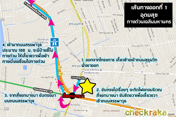 ขาเข้าเส้นทางที่ 1 จากทางด่วนพิเศษเฉลิมมหานคร มาดูภาพประกอบการเดินทางกันค่ะ โดยเราจะเริ่มบริเวณซอยสุขุมวิท 62 (หลังจากลงจากทางพิเศษเฉลิมมหานครแล้ว)