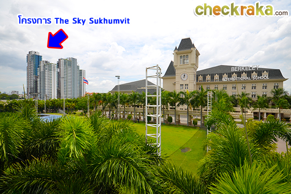 โรงเรียนนานาชาติเบิร์คลีย์ ระยะทางห่างจากโครงการประมาณ 2 กิโลเมตร มองจากสะพานลอยหน้าโรงเรียน เห็นโครงการ The Sky Sukhumvit ชัดเจนเลยค่ะ รูปแบบตึก และตัวโครงการโดยรวม