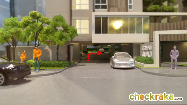 ส่วนทางซ้ายมือจะเป็นส่วนของพื้นที่จอดรถ แต่ถ้าจะลงไปจอดชั้นใต้ดินต้องขับวนไปทางขวามือค่ะ