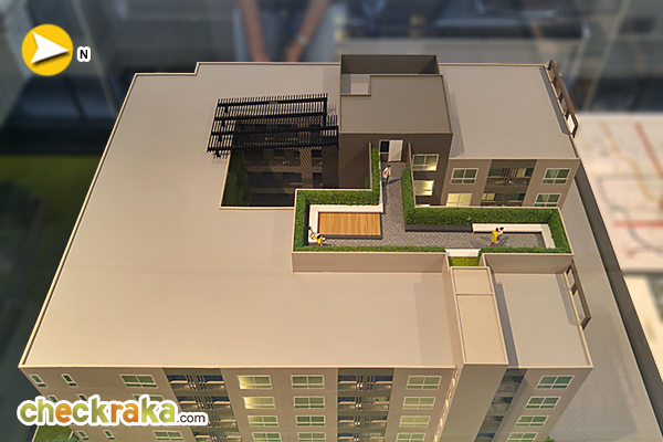 โมเดลโครงการมุมมองบนชั้นดาดฟ้าของโครงการ จัดพื้นที่เป็นสวนสไตล์เซน สำหรับนั่งรับลมยามเย็น