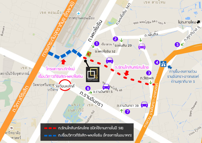 โครงการ เทมโป ควอด สะพานใหม่ ตั้งอยู่บนถนนรัตนโกสินทร์สมโภชซึ่งเป็นถนนตัดใหม่ กำหนดการเปิดใช้งานยังไม่แน่นอน แต่ไม่น่าเกินปี 2558 นี้ มีจุดเริ่มต้นที่บริเวณใกล้ซอยพหลโยธิน 50 ระหว่างบิ๊กซี สะพานใหม่ และโรงพยาบาลเซ็นทรัลเยนเนอรัล ตัดผ่านไปทางทิศตะวันออกจนถึงถนนวัชรพล สิ้นสุดที่ถนนสุขาภิบาล 5 ถนนเส้นนี้มีความสำคัญเนื่องจากจะเพิ่มเครือข่ายการเชื่อมต่อถนนสำคัญต่างๆ ในย่านนี้ เช่น ถนนพหลโยธิน, ถนนรามอินทรา, ถนนวัชรพล, ถนนเพิ่มสิน และถนนสุขาภิบาล 5 เข้าด้วยกัน ช่วยลดระยะทาง และเวลาในการเดินทางจากเดิมที่ต้องพึ่งถนนพหลโยธิน และถนนรามอินทราเป็นหลัก โดยในอนาคตจะสามารถเชื่อมต่อไปยังถนนหทัยราษฎร์ และถนนนิมิตรใหม่ได้ นอกจากนี้ยังมีโครงการในอนาคตอย่างถนนตัดใหม่ระหว่างถนนวิภาวดีรังสิต และถนนพหลโยธิน (ยังไม่มีชื่ออย่างเป็นทางการ) แนวเส้นทางจะเริ่มจากบริเวณใกล้ร้านเจ้เล้งบนถนนวิภาวดีรังสิตผ่านไปยังคลองบางเขนข้ามไปยังถนนพหลโยธินประจบกับบริเวณถนนตัดใหม่รัตนโกสินทร์สมโภชพอดี ซึ่งถ้าโครงการสร้างเสร็จก็จะเพิ่มศักยภาพให้กับทำเลแถวนี้ได้เป็นอย่างมาก