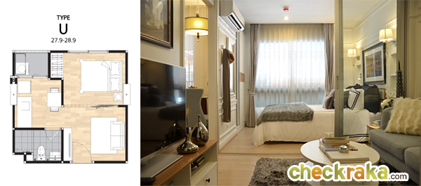 - Type U : ห้องแบบ 1 ห้องนอน (1 ห้องนอน, 1 ห้องน้ำ, 1 ห้องครัวแยก) - เนื้อที่ 27.9 - 28.9 ตร.ม