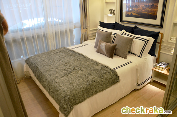 บริเวณปลายเตียงนอน ห้องจริงของ Tempo Quad ทางซ้ายจะเป็นโต๊ะเครื่องแป้ง ส่วนตู้เสื้อผ้าจะอยู่ทางขวา