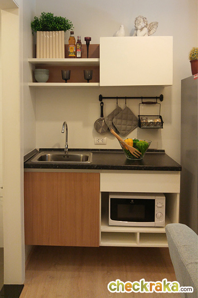- รูปแบบห้องและวัสดุ - ขนาดห้องมีให้เลือก 4 Type ห้องส่วนใหญ่เป็นแบบ 1 ห้องนอน หันหน้าเข้าหาทิศตะวันออก และทิศตะวันตก ทำให้ห้องได้รับแดดในช่วงเช้า และช่วงบ่าย แต่ทางโครงการติดกระจกสีเขียวตัดแสงมาให้ช่วยลดความร้อนจากแดดได้บ้าง ส่วนห้องแบบ 2 ห้องนอนจะอยู่โซนด้านหน้าโครงการฝั่งทิศเหนือ ขนาดห้องของที่นี่เริ่มต้นที่ 25.2 ตร.ม. แบบ 1 ห้องนอน ซึ่งเป็นขนาดที่อยู่และใช้งานได้จริง ไม่เล็กจนเกินไป ทุก Type กั้นห้องนอนแยกออกเป็นสัดส่วนดีค่ะ ติดอยู่นิดนึงตรงที่ห้องครัวของบาง Type เป็นครัวแบบเปิด เวลาทำอาหารอาจมีกลิ่นลอยไปรบกวนโซนอื่นๆ ของห้องบ้าง ส่วนวัสดุที่ใช้ได้ตามมาตรฐานทั่วไป ไม่ว่าจะเป็น พื้นลามิเนต, ประตู HDF, พื้นห้องน้ำ และพื้นระเบียงที่เป็นกระเบื้องขนาด 30x30 ซม.