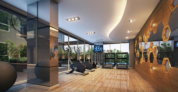 และติดกันจะเป็นห้องฟิตเนส มองเห็นด้านหน้าโครงการ สระว่ายน้ำ และตัวสวนจะอยู่ตรงพื้นที่ Court